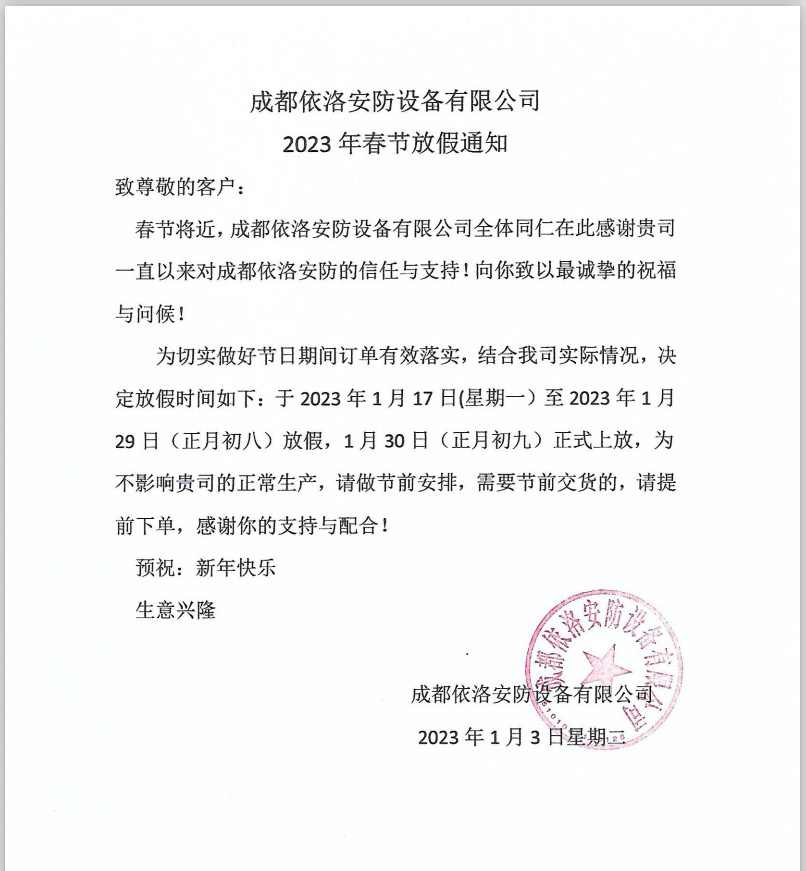 成都依洛安防設(shè)備有限公司2023年春節(jié)放假通知: