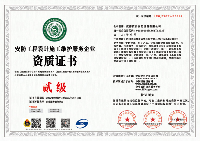 成都監(jiān)控安裝公司 之 安防工程設(shè)計(jì)施工維護(hù)資質(zhì)證書(shū)(貳級(jí))